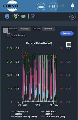 Cornell Co-Pilot allows you to monitor single and multiple pumps via IIoT cloud. With built-in battery power, you can monitor temperature, vibration and GPS location, and additionally monitor flow, pressure, start/stop operations and more when connected to external power. The real time pump data can be used for maintenance, wear estimation, and critical conditions, as well as receive alerts for preset running conditions.
