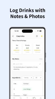 Log cocktails, beers, wines, and spirits with notes, ratings, and photos. Create your own searchable drink journal and keep your favorites close at hand.